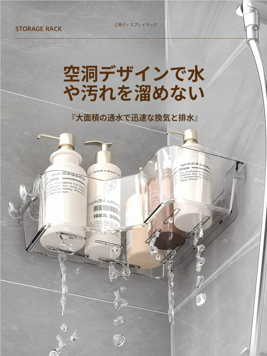 トイレ用コーナー収納ラック|三角形デザインで化粧品や小物をスッキリ整理!壁掛け式&穴あけ不要で簡単取り付け。美しいバスルームを実現しましょう!