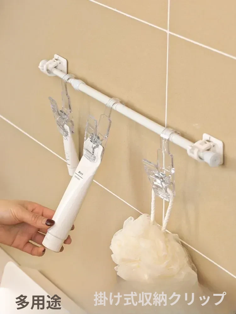日本製多目的透明プラスチックフッククリップ - 洗顔料や歯磨き粉をすっきり収納!バスルームに最適な吊り下げ収納クリップで、スペースを有効活用しましょう!