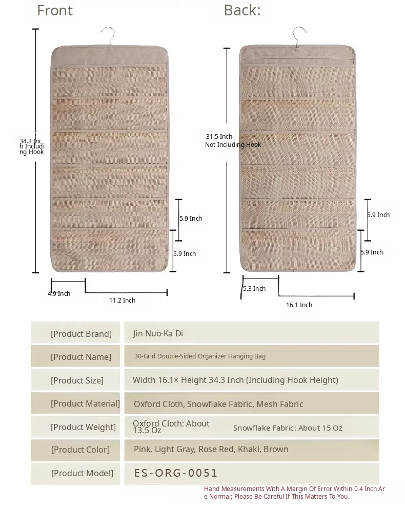 Khaki Oxford Cloth 30-Compartment Organizer, 16.14in*34.25in(No Zipper)