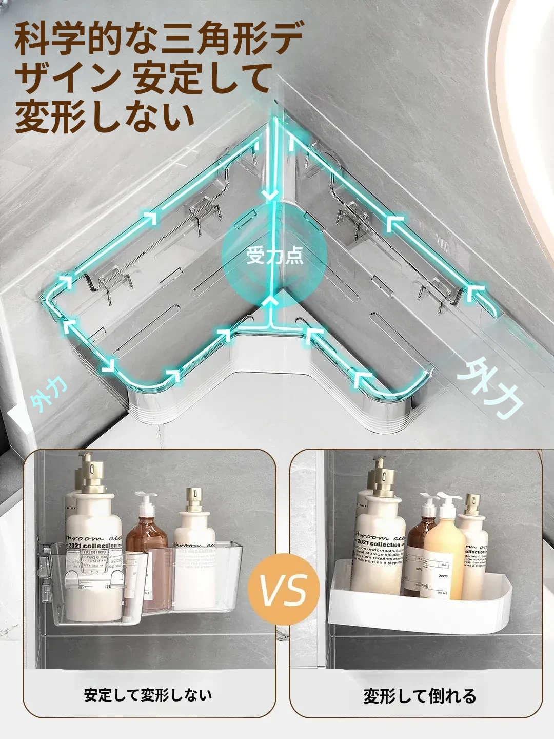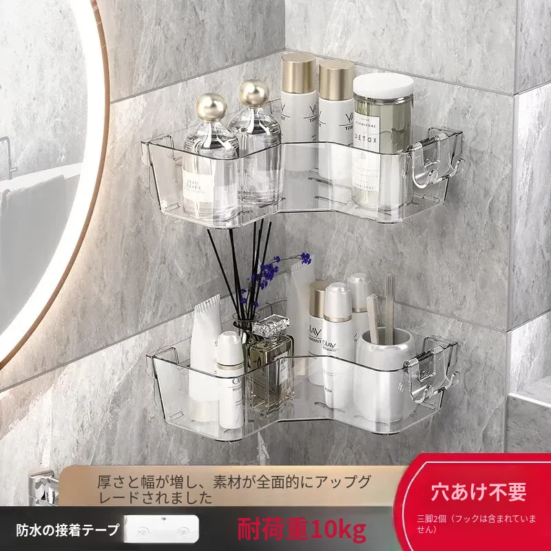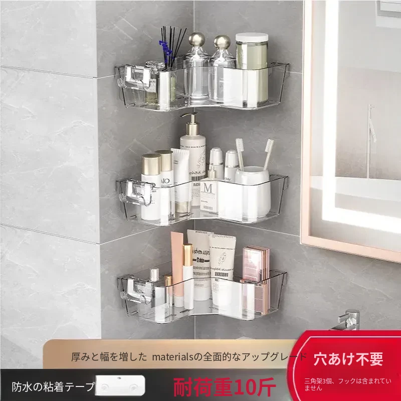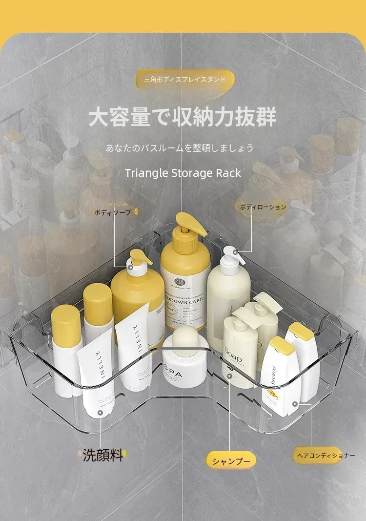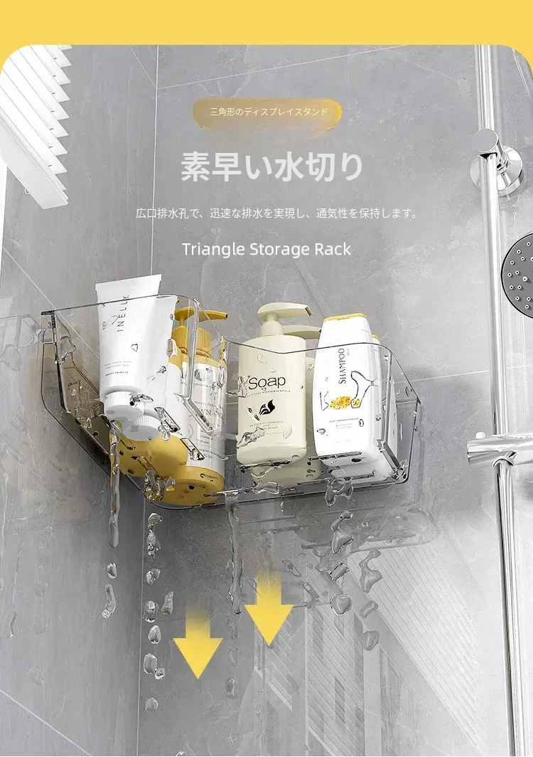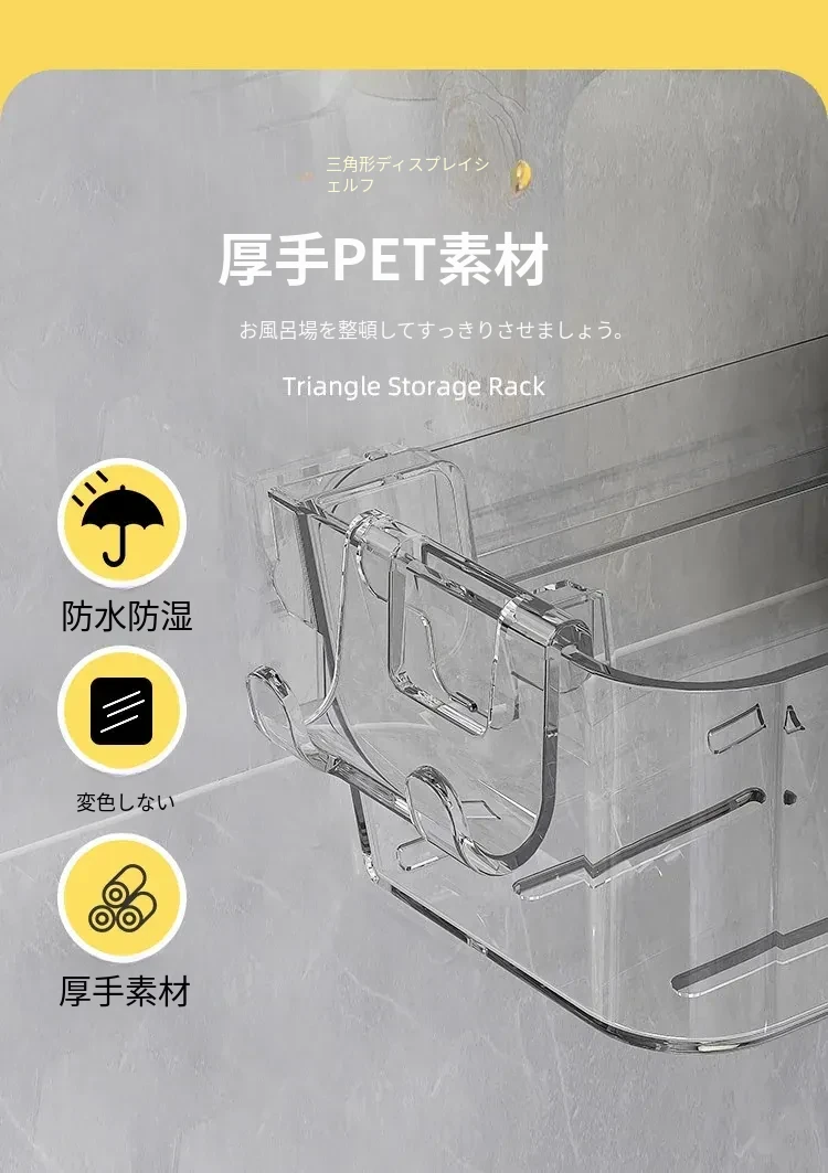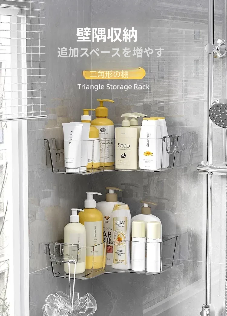トイレ用コーナー収納ラック|三角形デザインで化粧品や小物をスッキリ整理!壁掛け式&穴あけ不要で簡単取り付け。美しいバスルームを実現しましょう!