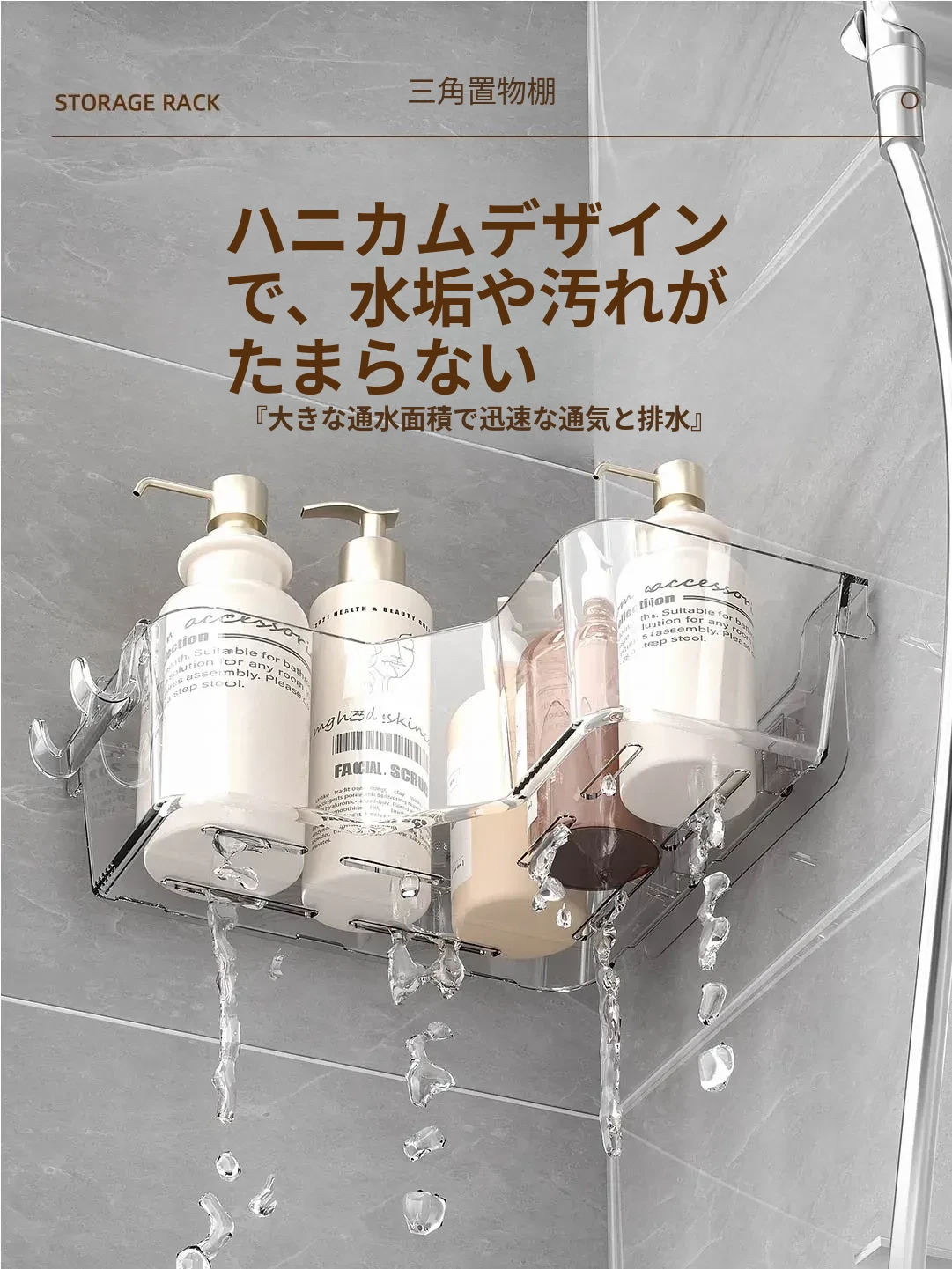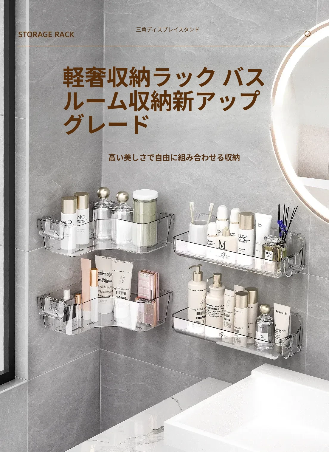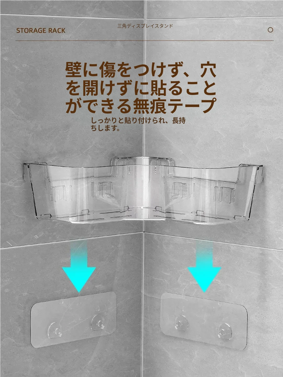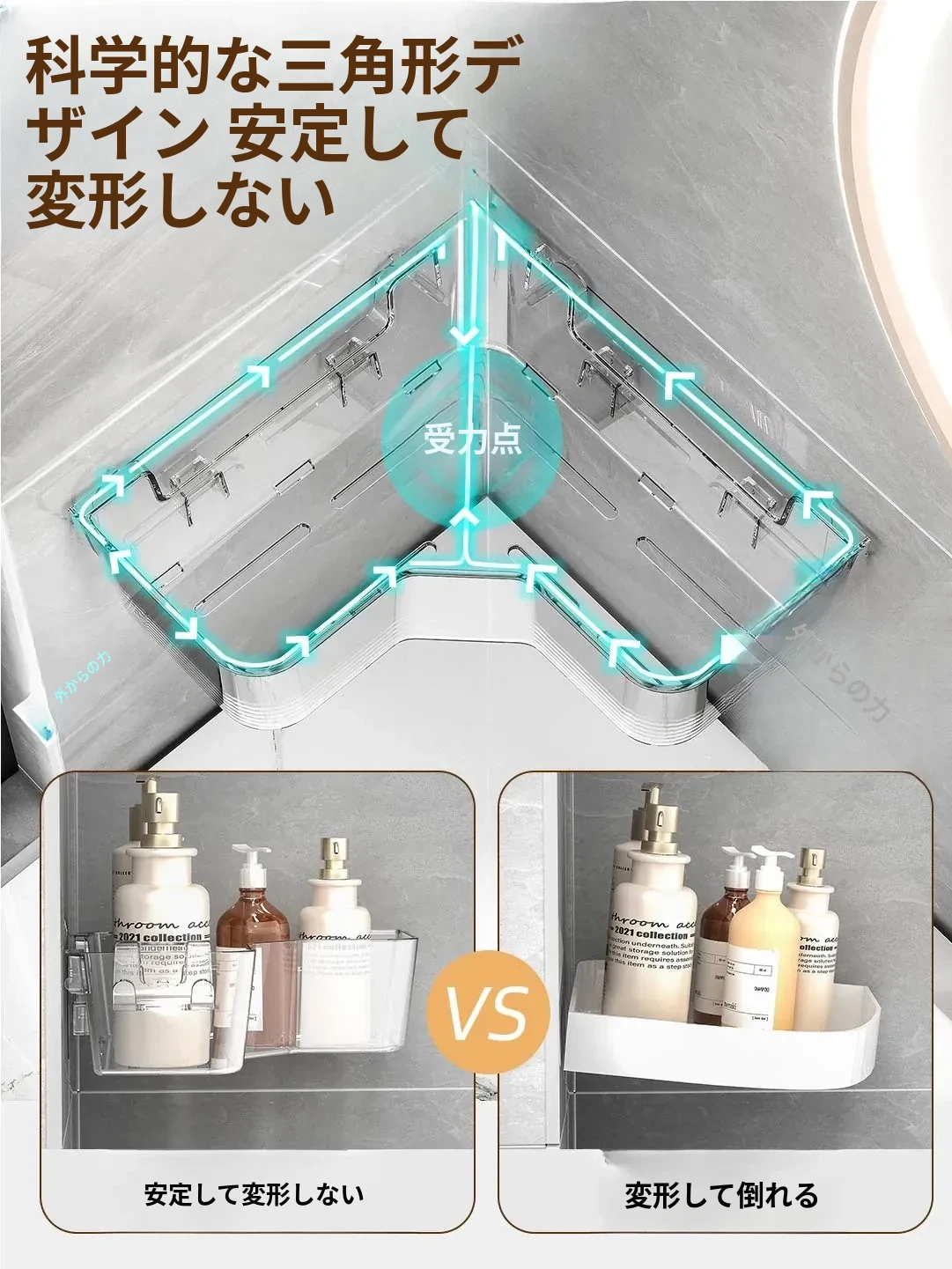 トイレ用コーナー収納ラック|三角形デザインで化粧品や小物をスッキリ整理!壁掛け式&穴あけ不要で簡単取り付け。美しいバスルームを実現しましょう!