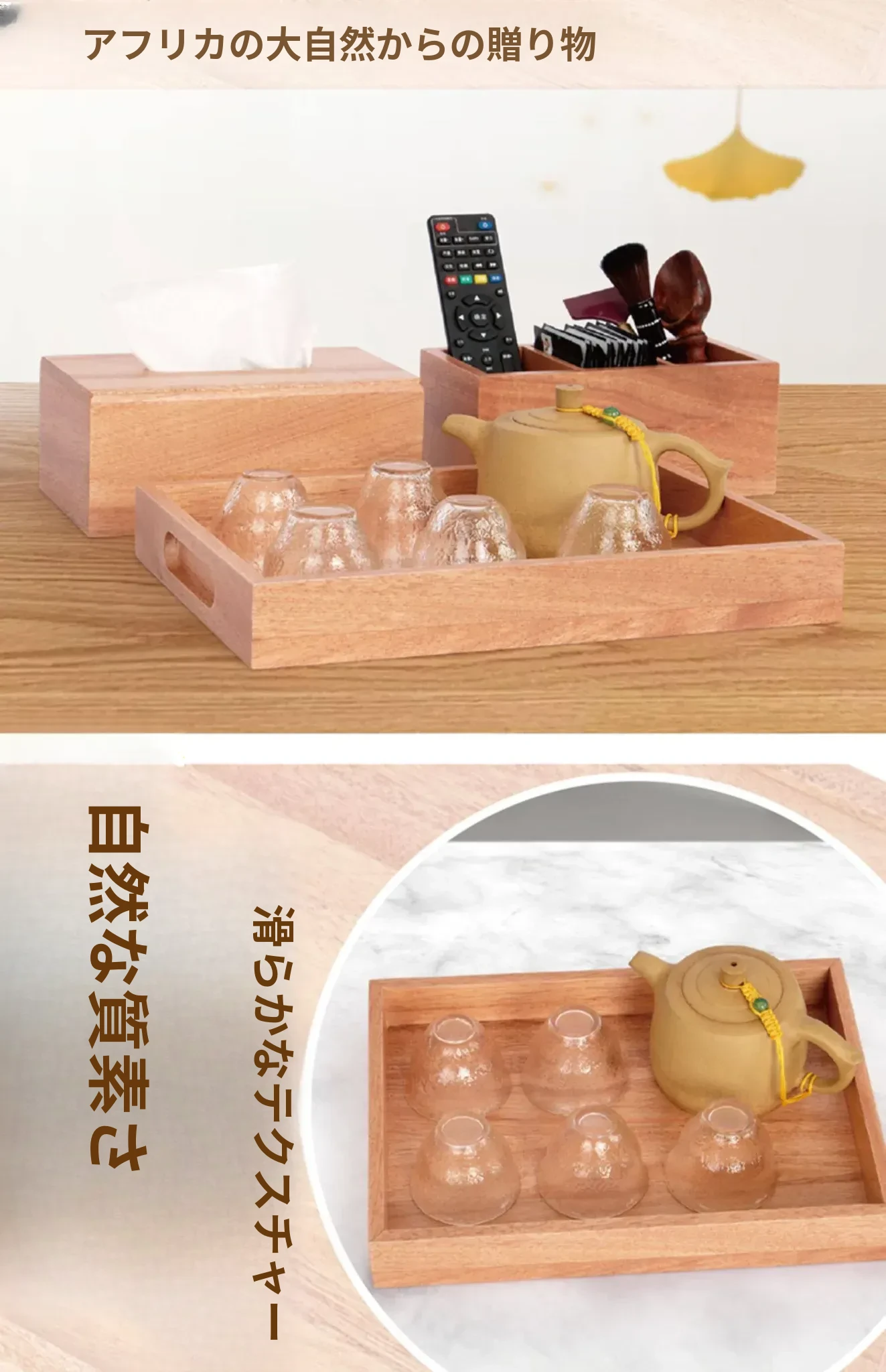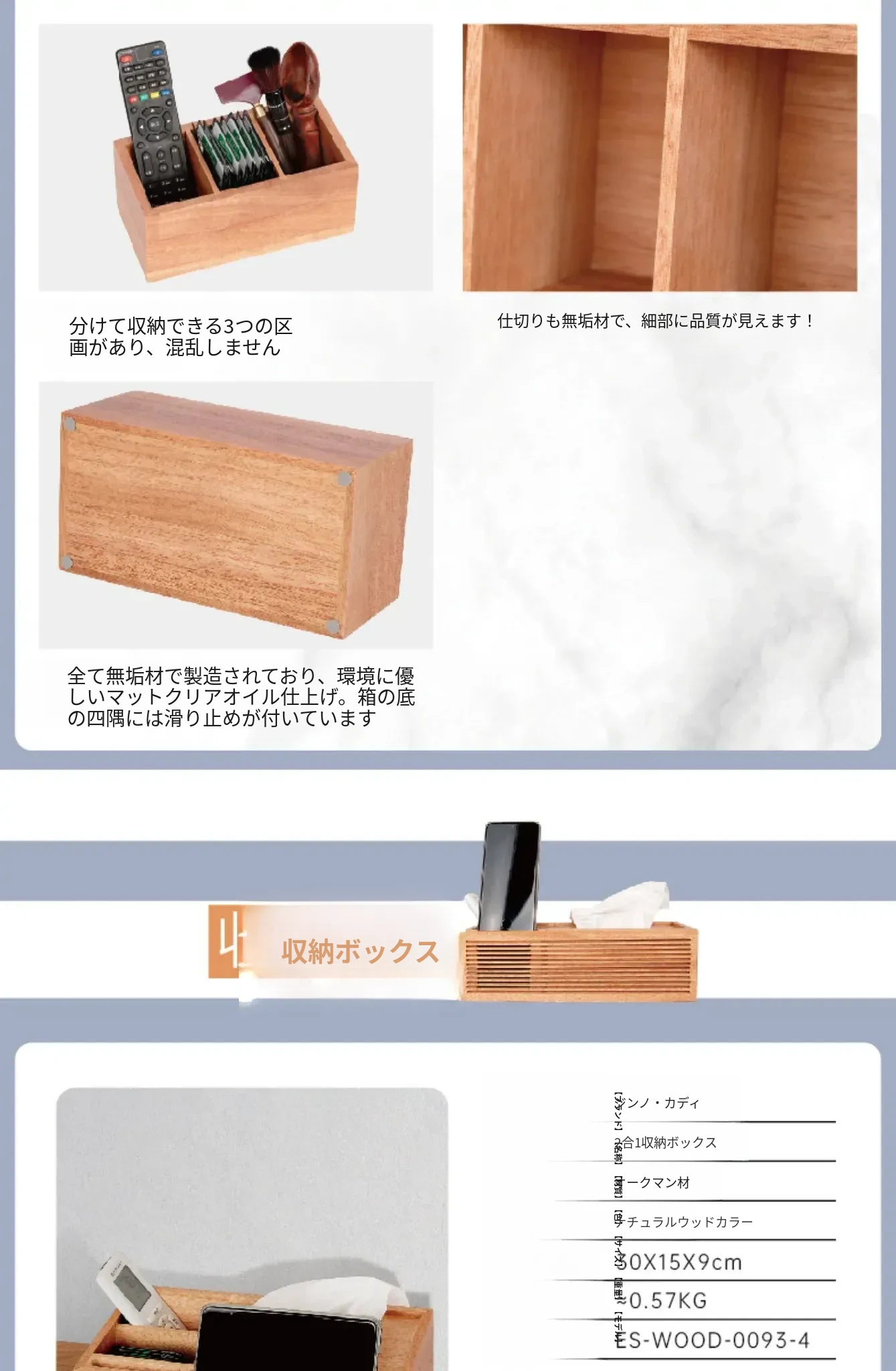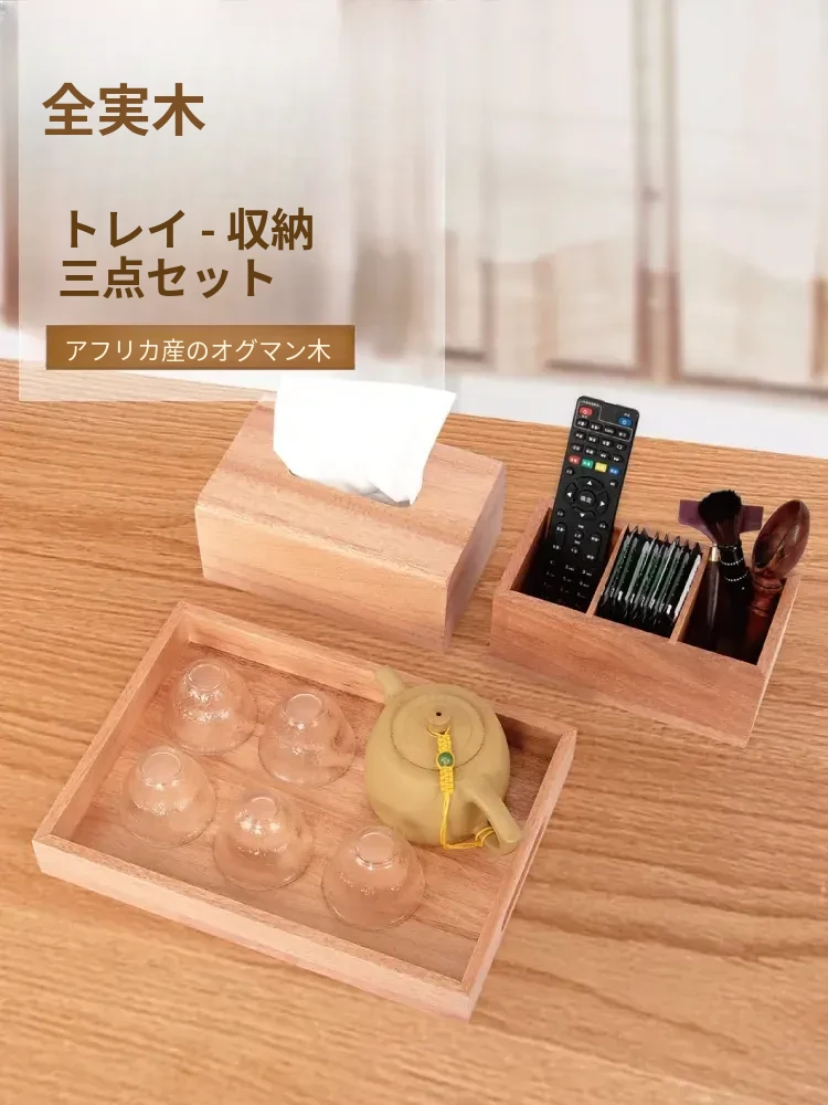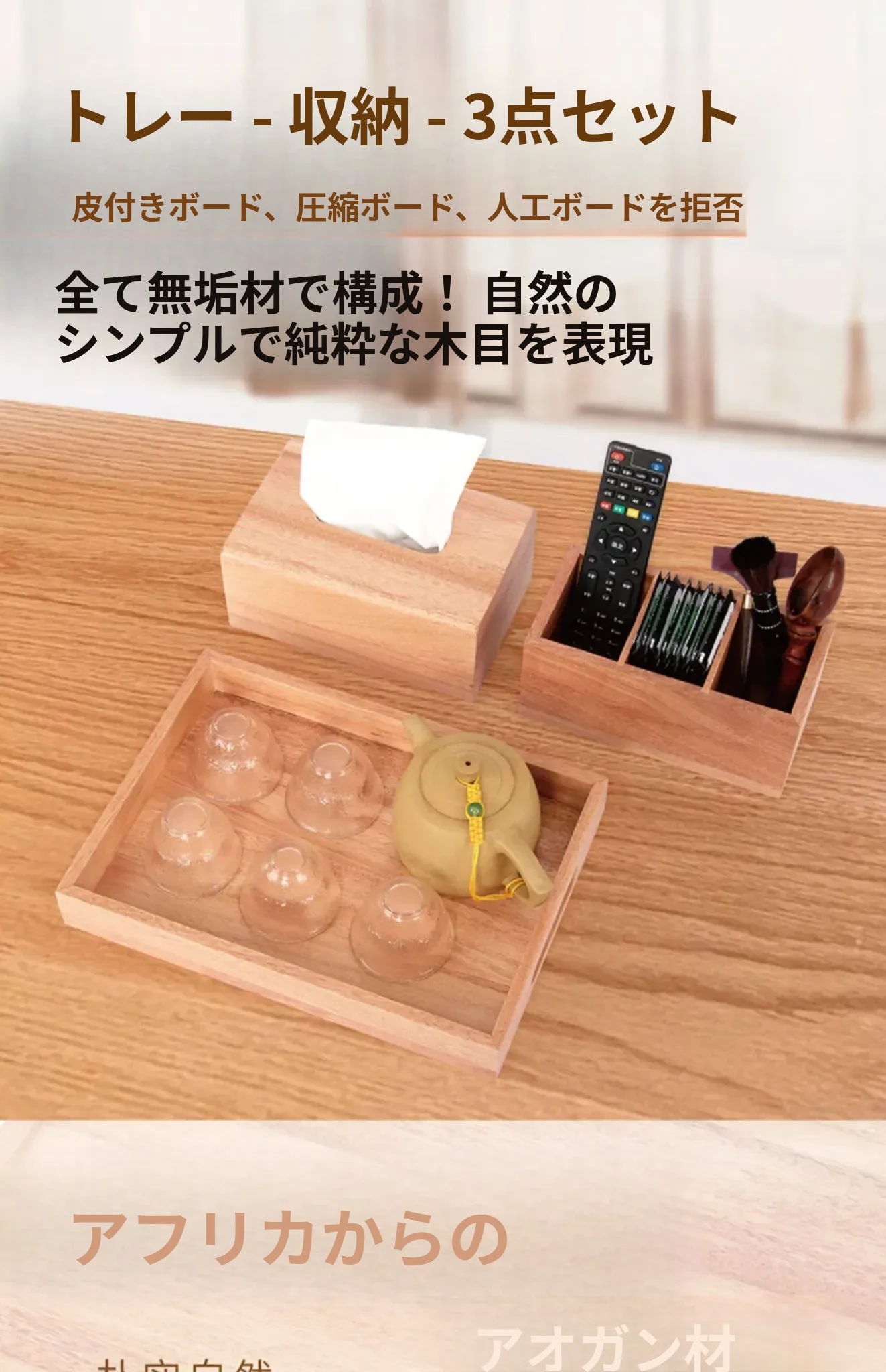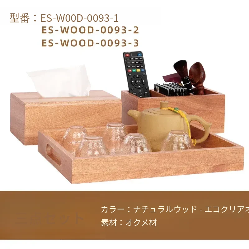 ナチュラルウッドカラーの3点セット ティッシュボックス+トレイ+3分割収納ボックス