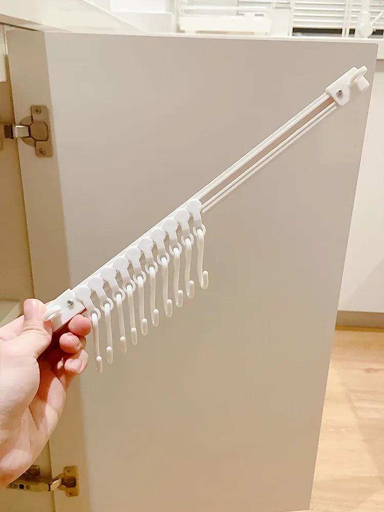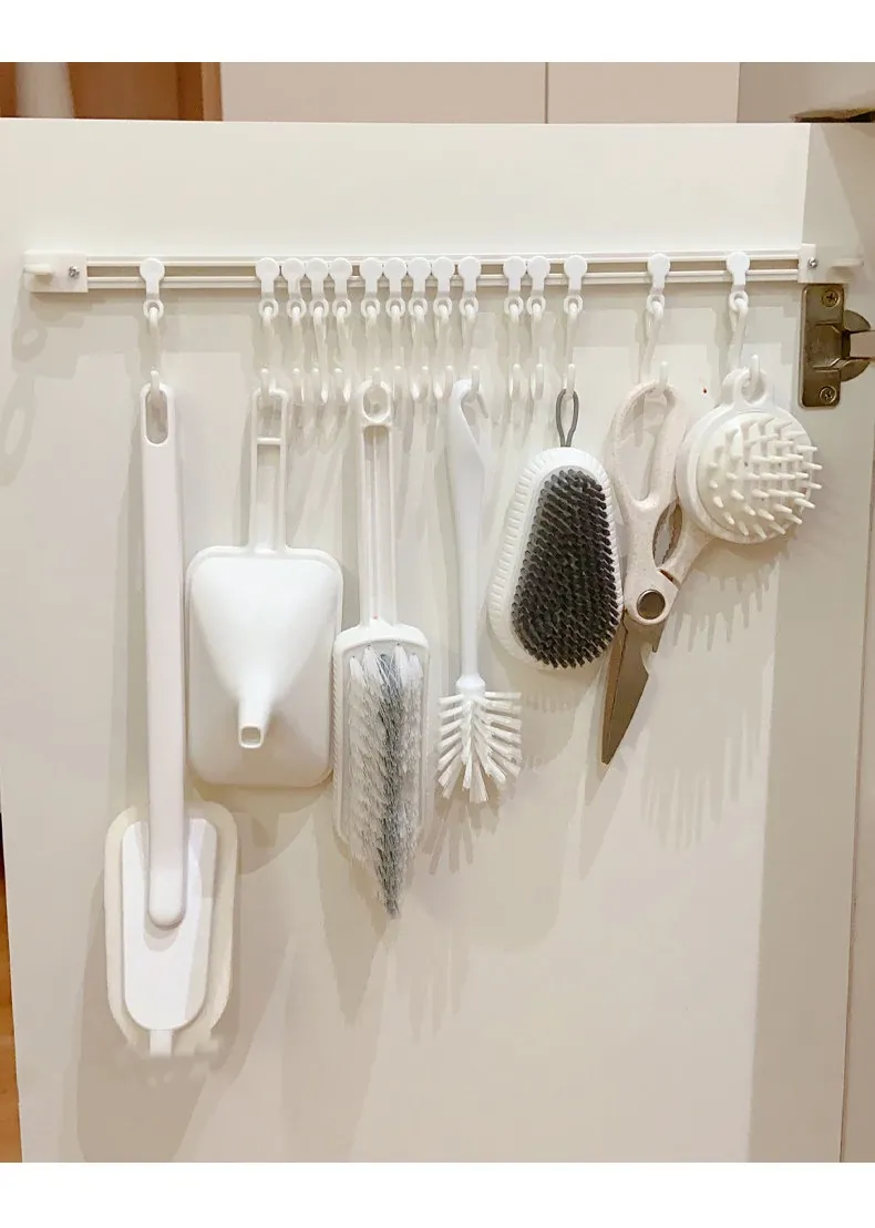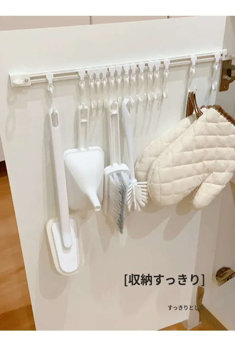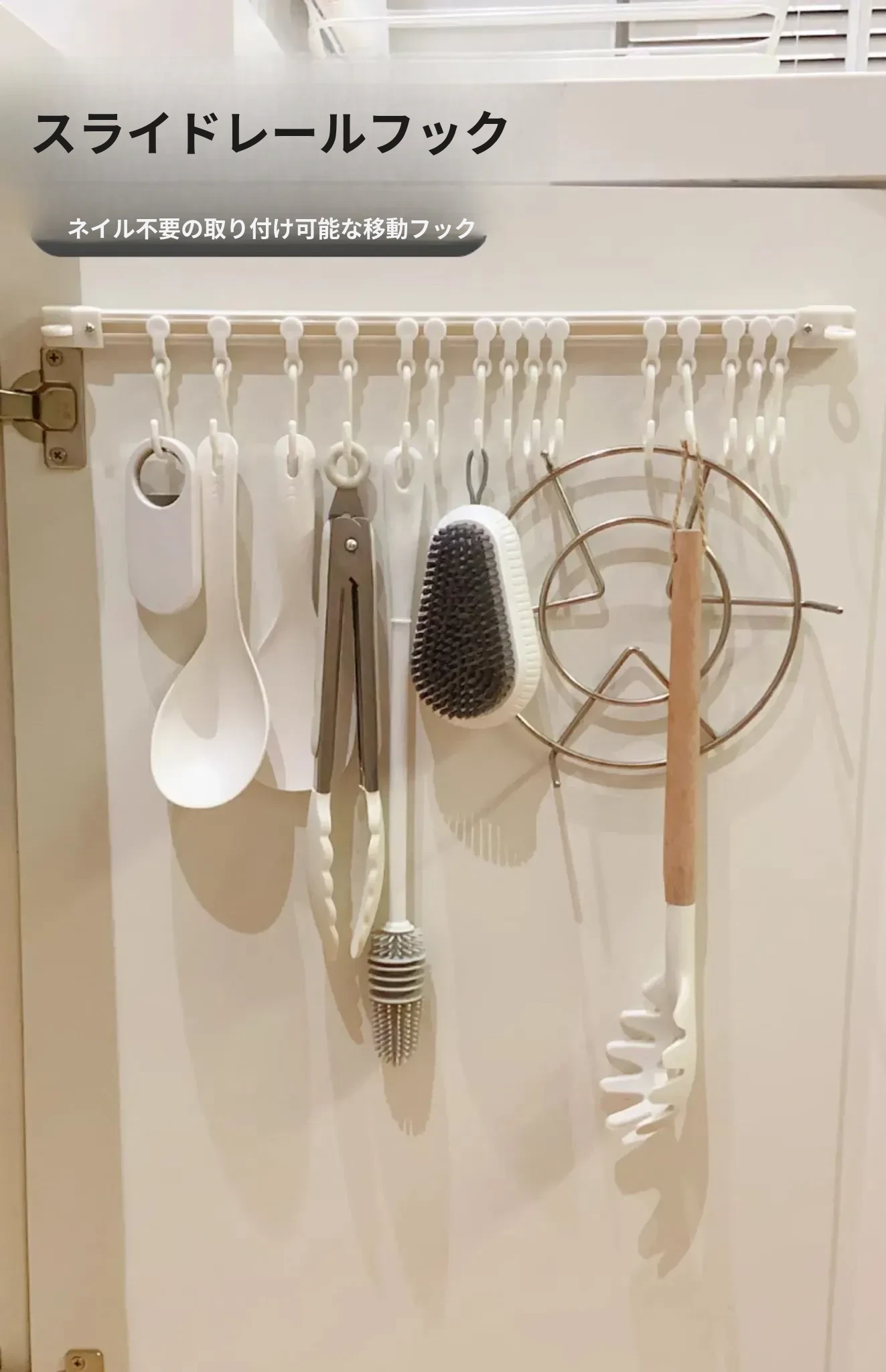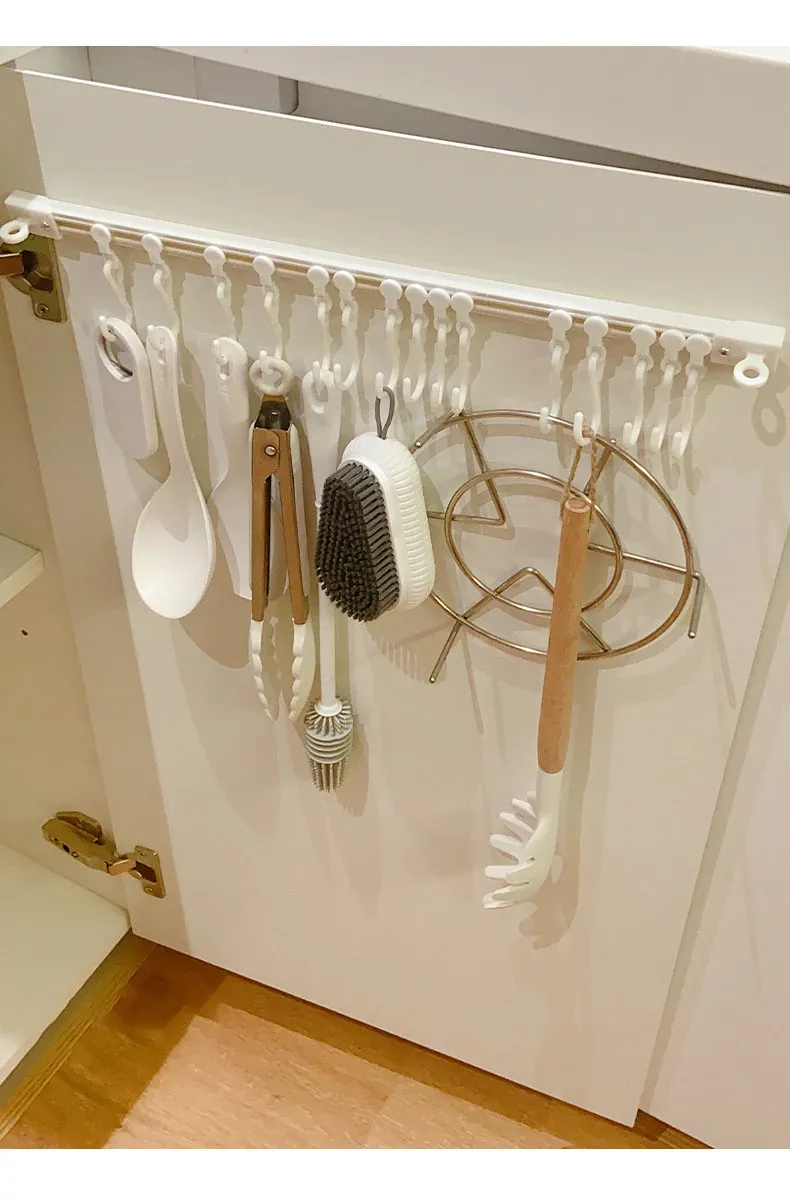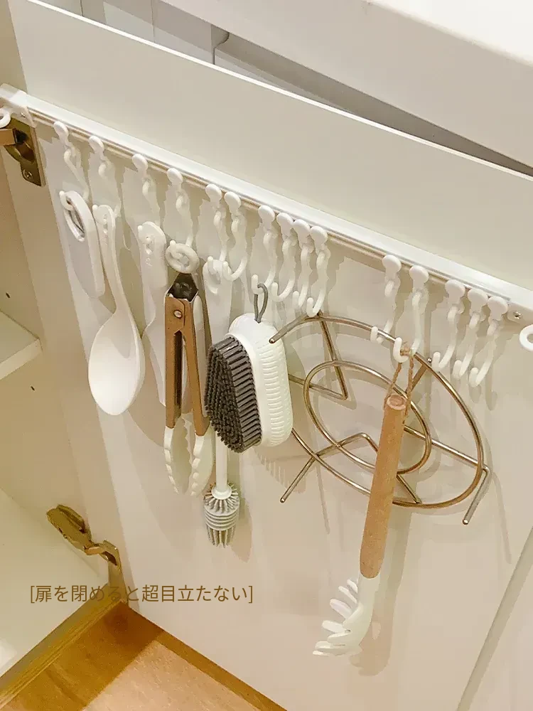 キッチンのスペースを最大限に活用!穴あけ不要の収納フックレール式スライドラック、キャビネットドア内側にぴったりフィットする便利なアイテム。整理整頓が簡単にできる、あなたのキッチンの頼れる助っ人!