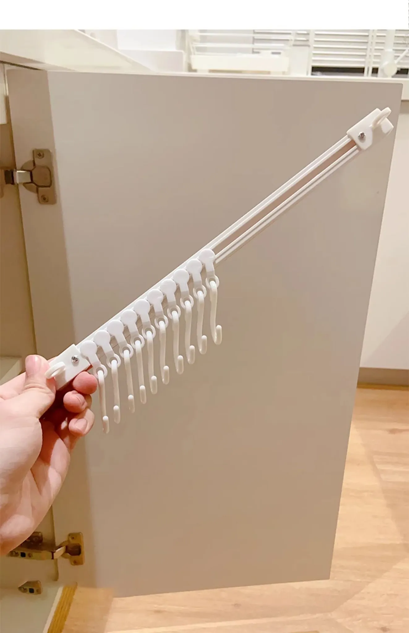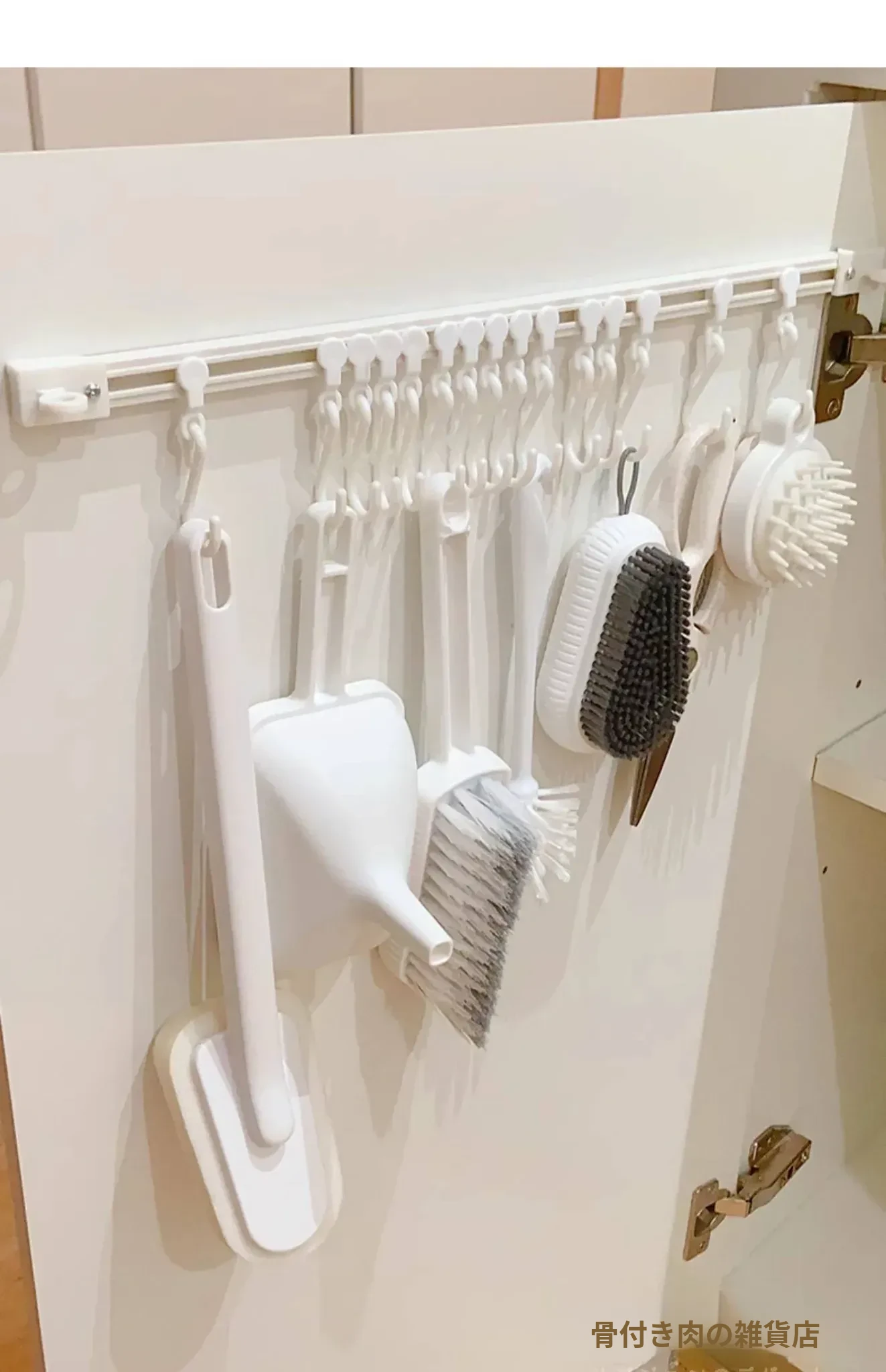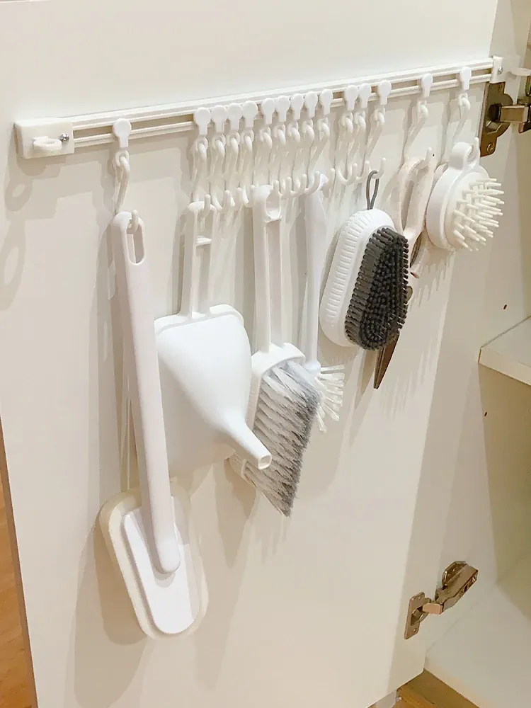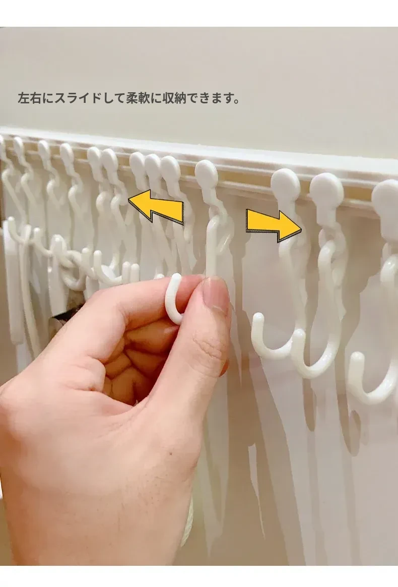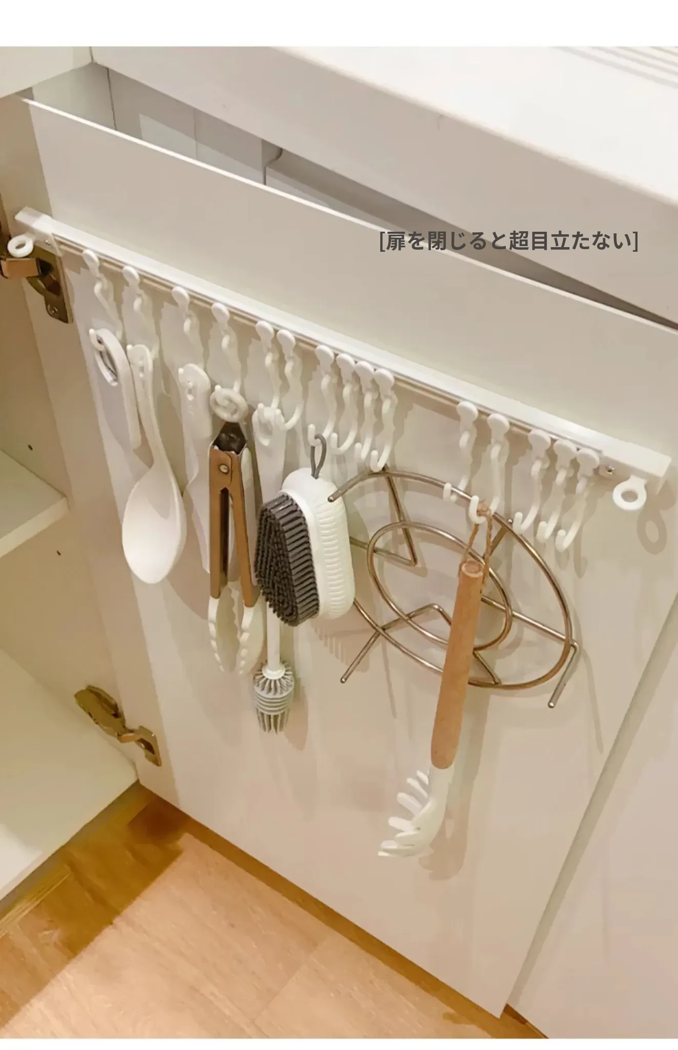 キッチンのスペースを最大限に活用!穴あけ不要の収納フックレール式スライドラック、キャビネットドア内側にぴったりフィットする便利なアイテム。整理整頓が簡単にできる、あなたのキッチンの頼れる助っ人!