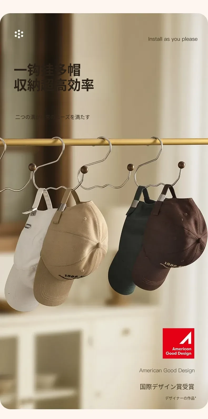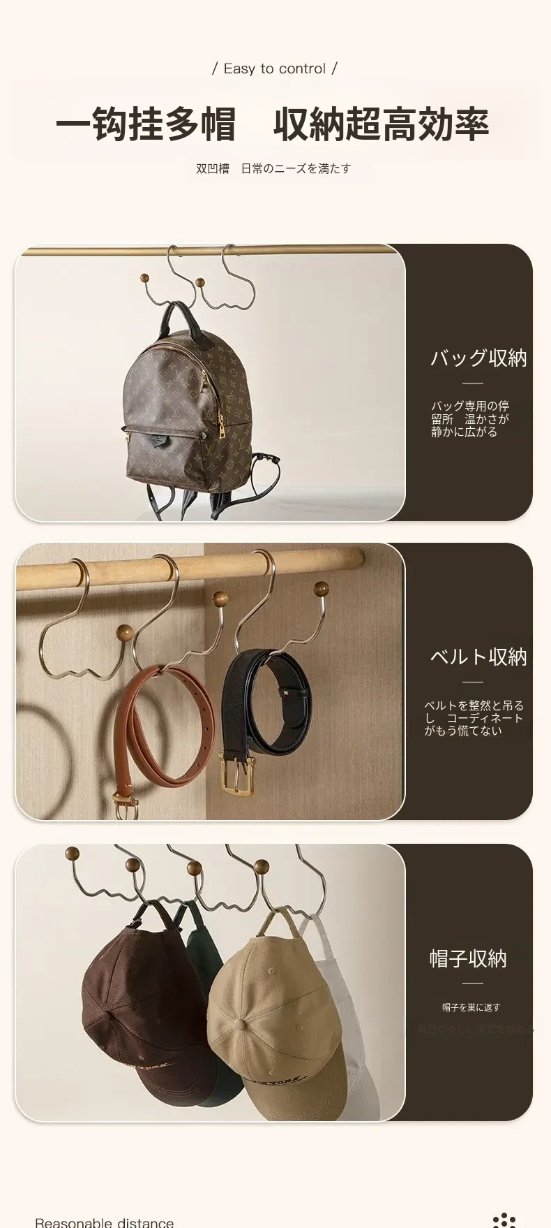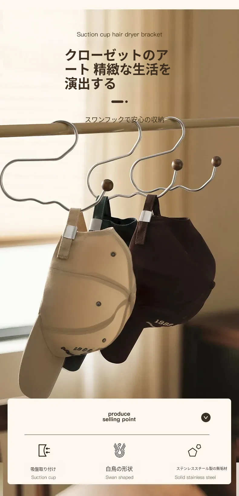 ステンレス製の帽子収納ラック - 穴を開けずに簡単取り付け!多機能木製ハンガーでクローゼットをすっきり整理!おしゃれで実用的な収納アイテムです。