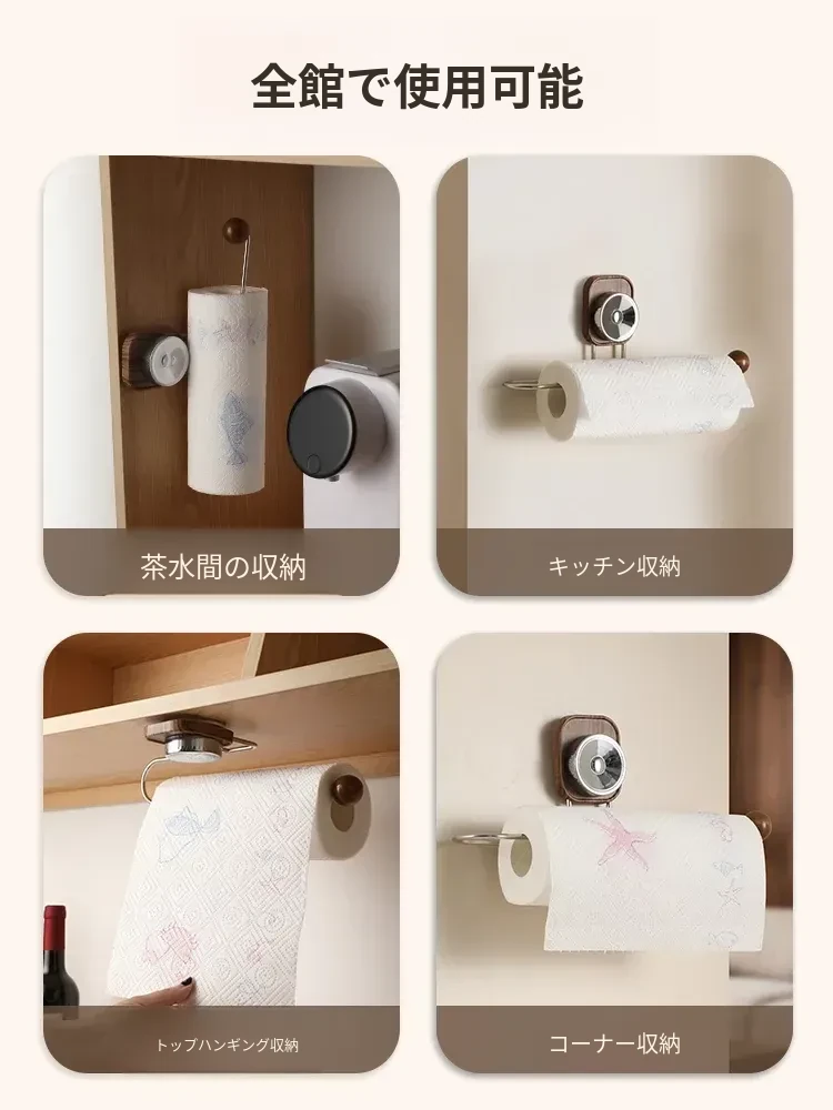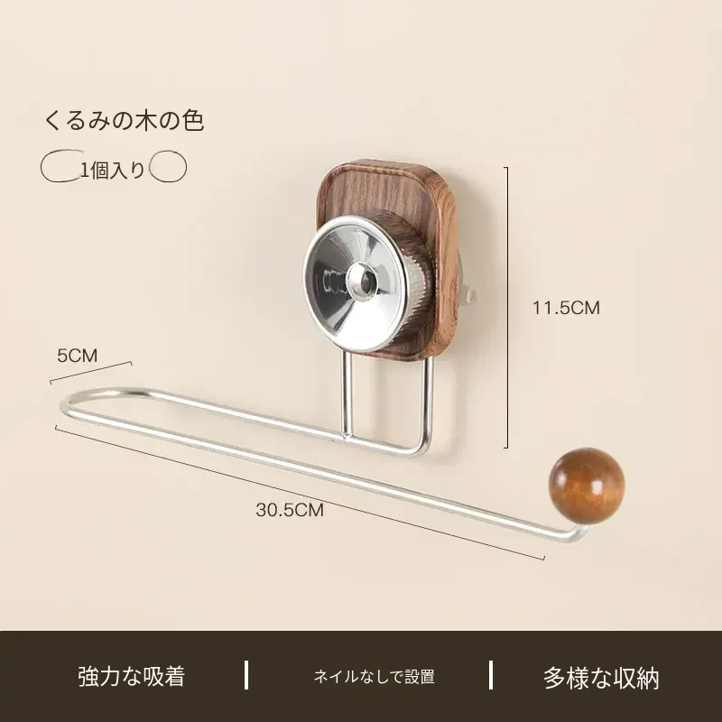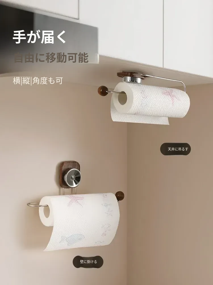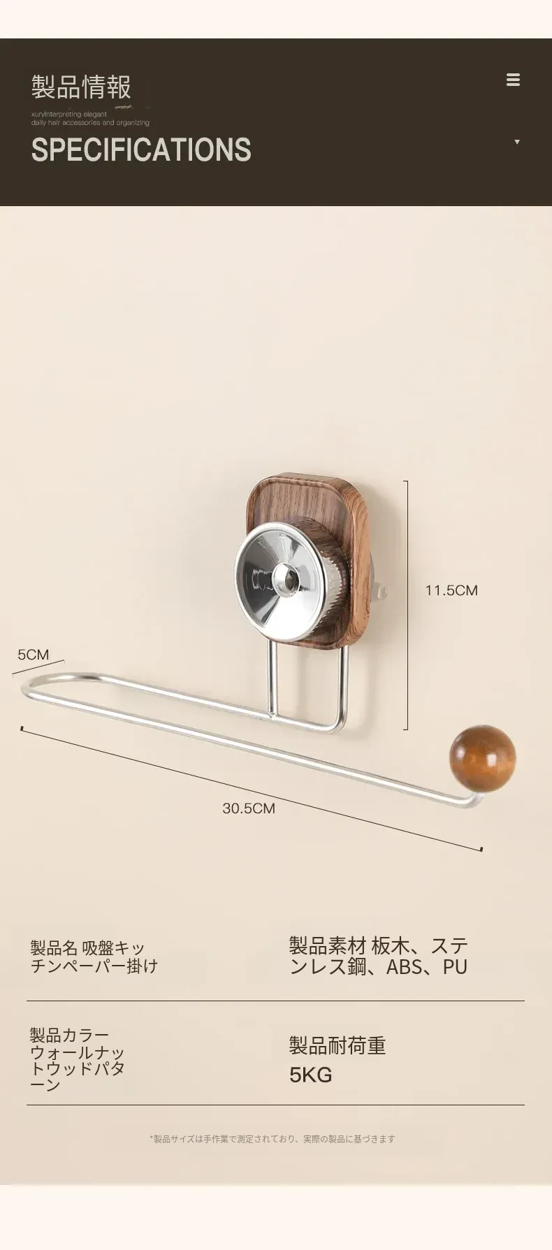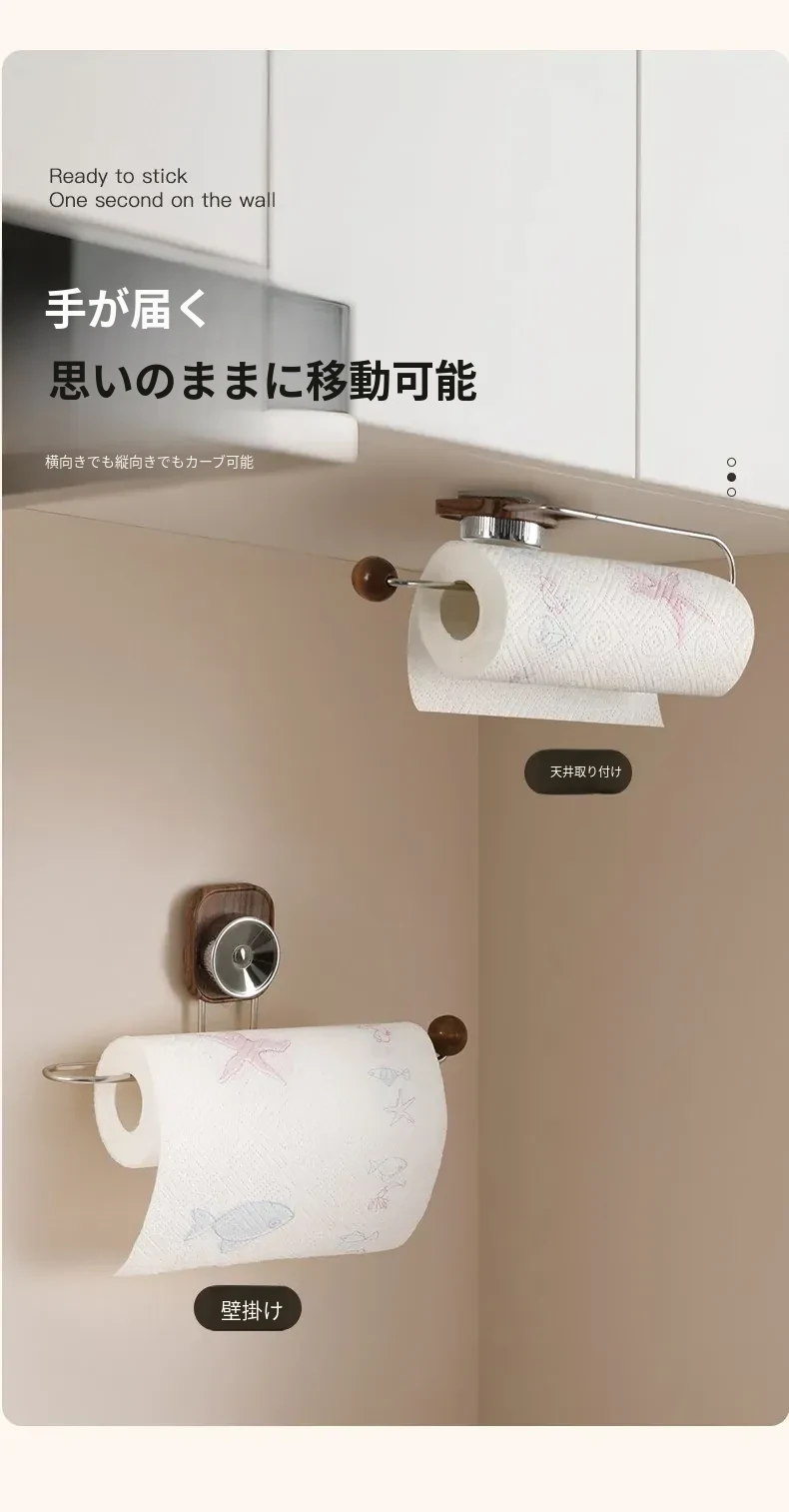 木目調キッチンペーパーラック|穴なし!強力吸盤で簡単取り付け|高級感あふれるシンプルなステンレス製収納ラック